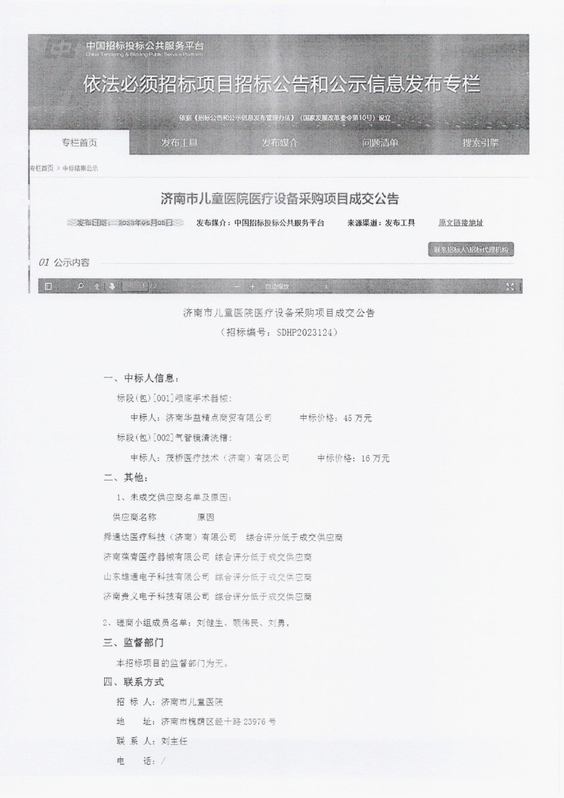 济南市儿童医院医疗设备采购项目成交公告